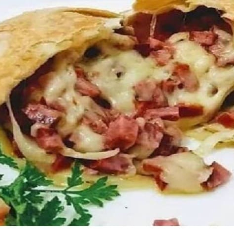 Mini pizza congelada recheada com presunto fatiado e queijo muçarela.