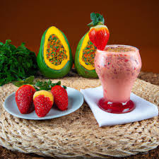 Delicioso suco de maracujá combinado com laranja, morango gengibre e mel, ideal para refrescar seu dia.