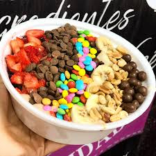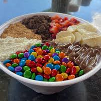 Delicioso açai, leite em po, leite condensado, paçoca, granulado, confete.
