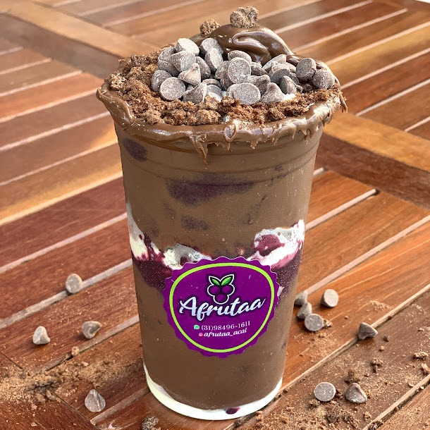 Delicioso Açaí 500ml acompanhado de Creme de Avelã, Ovomaltine, Gotas de Chocolate, Kit Kat, Bis, Leite em pó e Leite Condensado.