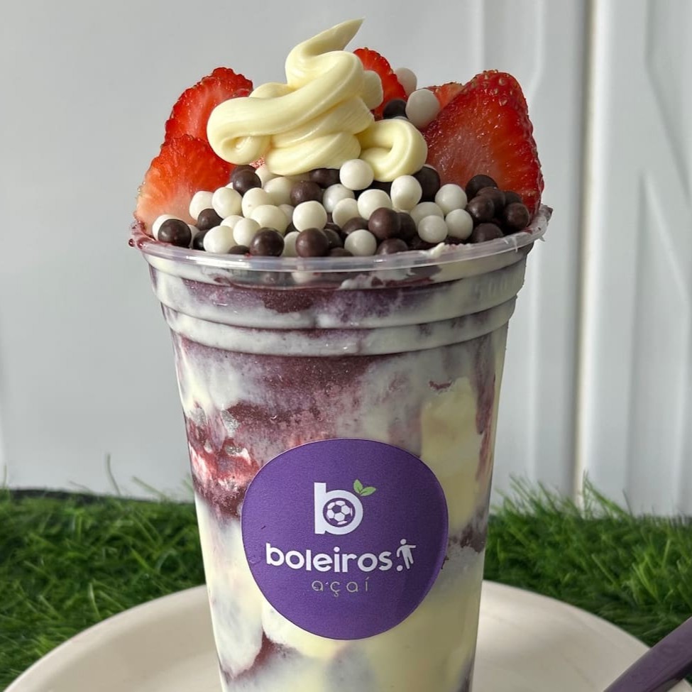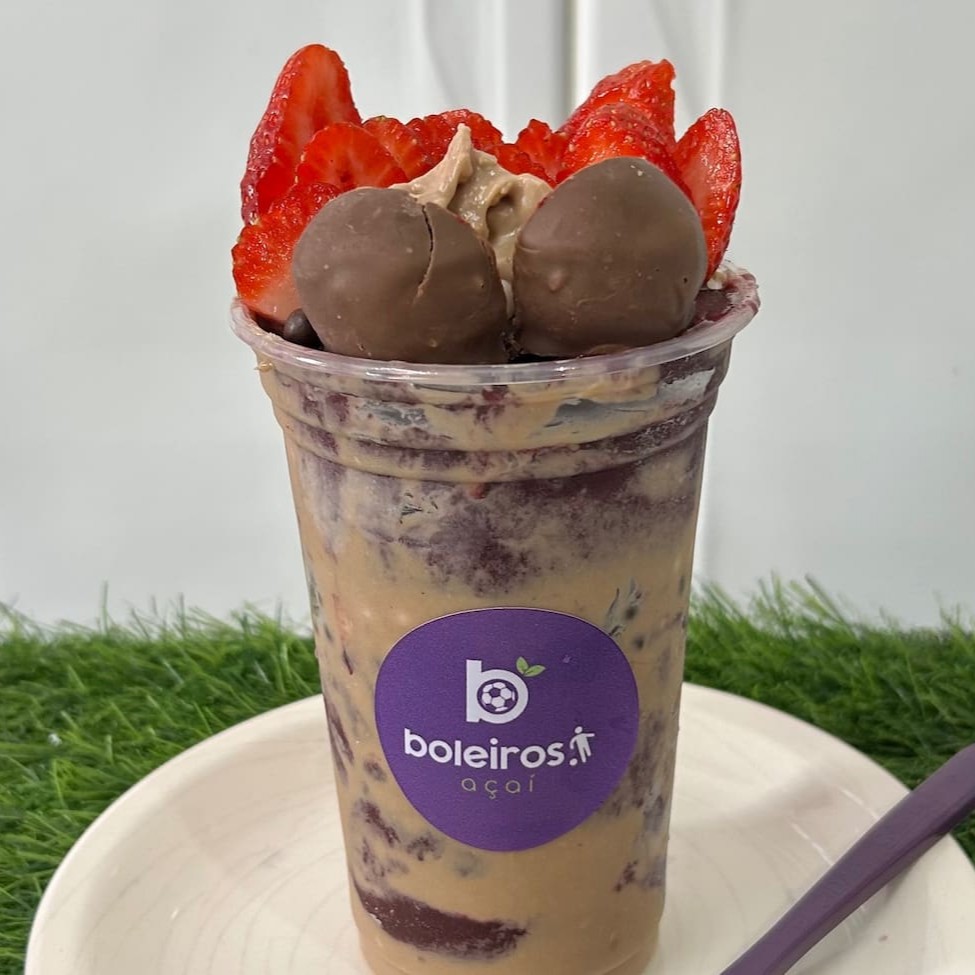 Açaí Da casa. Acompanha: Creme de leite Ninho, morango, bolibol, leite em pó. O Açaí é feito no ato do pedido, chegando fresquinho e saboroso.