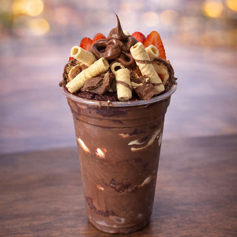 Açaí Sensação. Acompanha: creme de avelã, morango, canudinho e leite em pó. O Açaí é feito no ato do pedido, chegando fresquinho e saboroso.