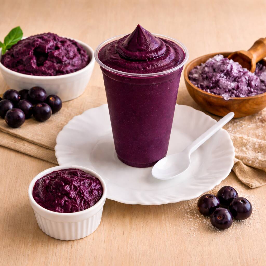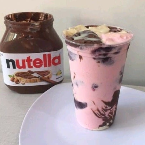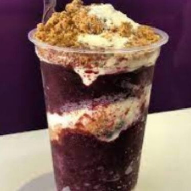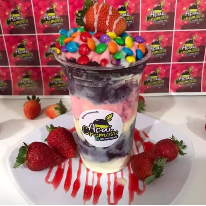 Acompanha copo com creme de açaí cremoso, creme de avelã , creme Ninho, Confete , leite em pó e morango.