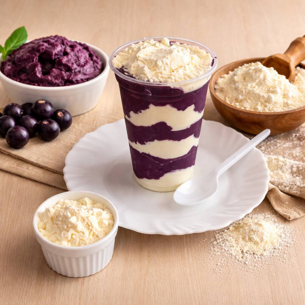 Acompanha Leite em pó, paçoca , leite condensado, morango , banana e açaí cremoso.