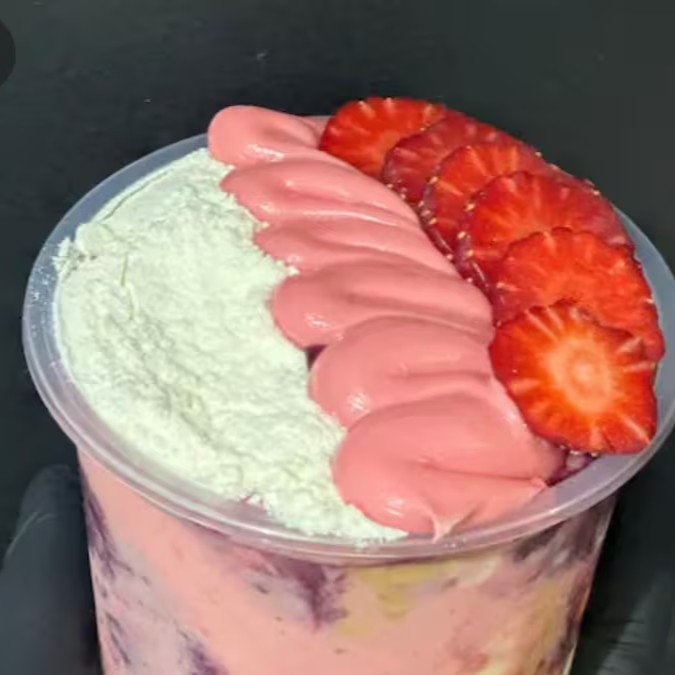 Açaí, creme de morango, leite em pó ,morangos frescos