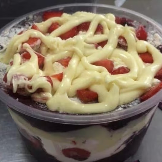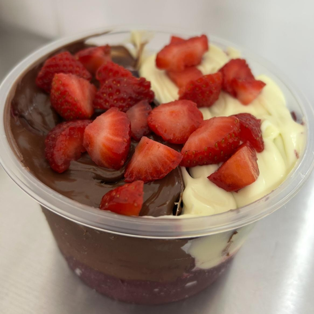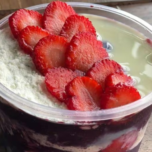 Açaí ,creme de morango, leite em pó,morangos frescos