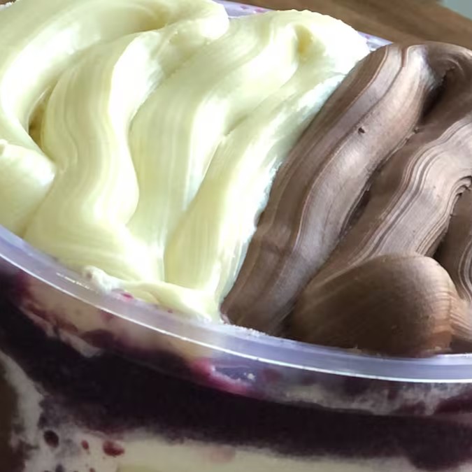 Açai, Nutella, Creme Ninho e leite em pó + 1 paçoca de brinde = 1º camada: Açai - 2º camada: Nutella, Creme Ninho e leite em pó - 3º camada: Açai - 4ª camada: Nutella, Creme Ninho e leite em pó