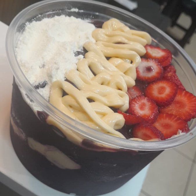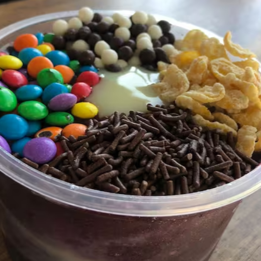Açaí, Confete, granulado, sucrilhos, chocopower, e leite condensado