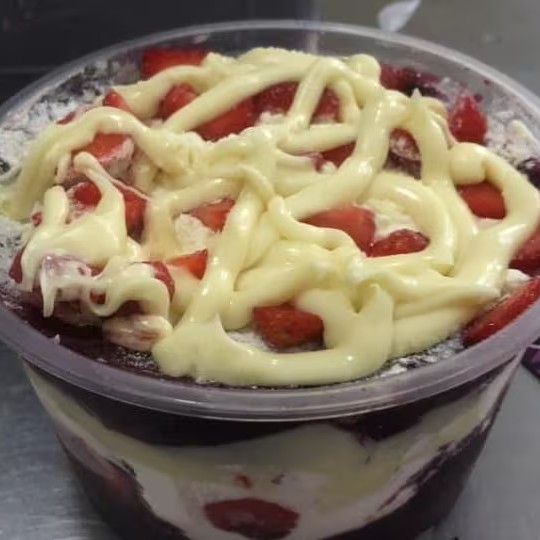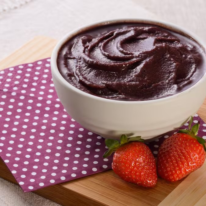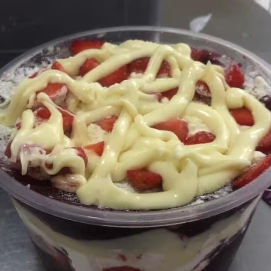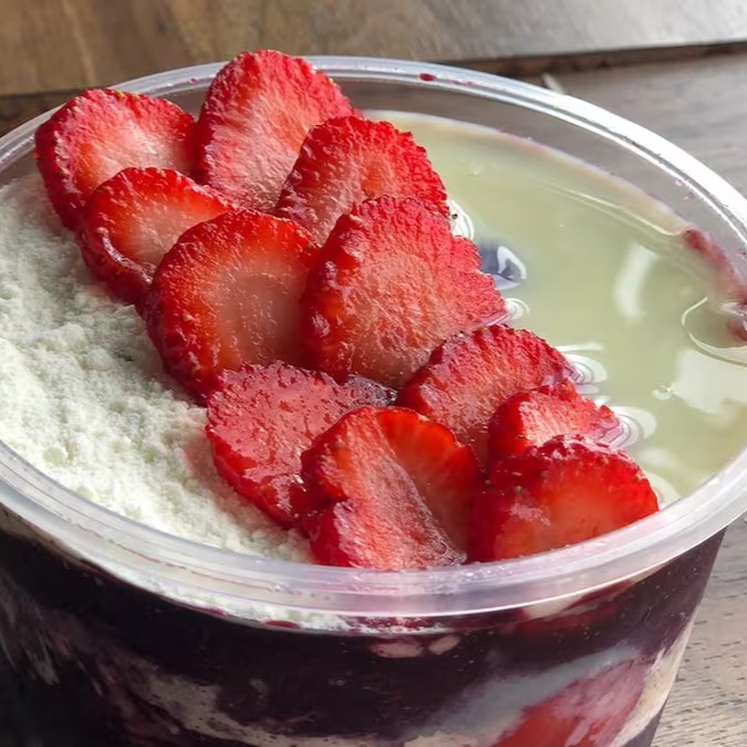 Açaí, creme de morango, leite em pó e deliciosos morangos frescos.