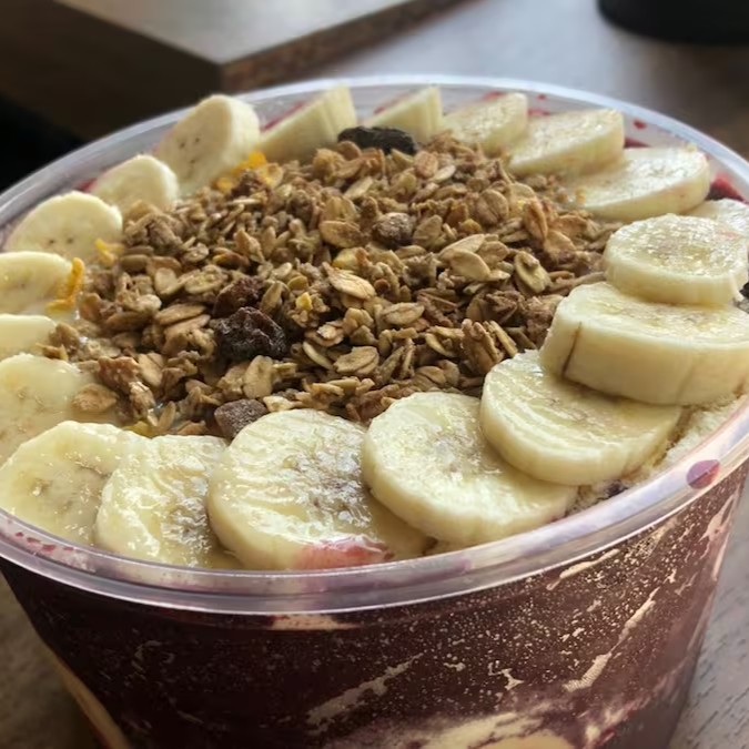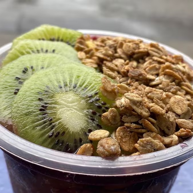 Açaí, banana, kiwi, morango, granola e leite em pó
