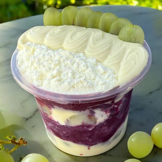 Açaí, Creme de Ninho, leite em pó e uva verde.