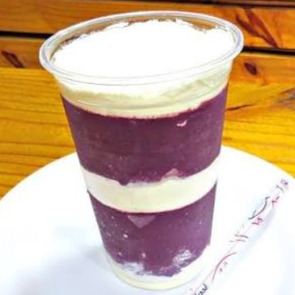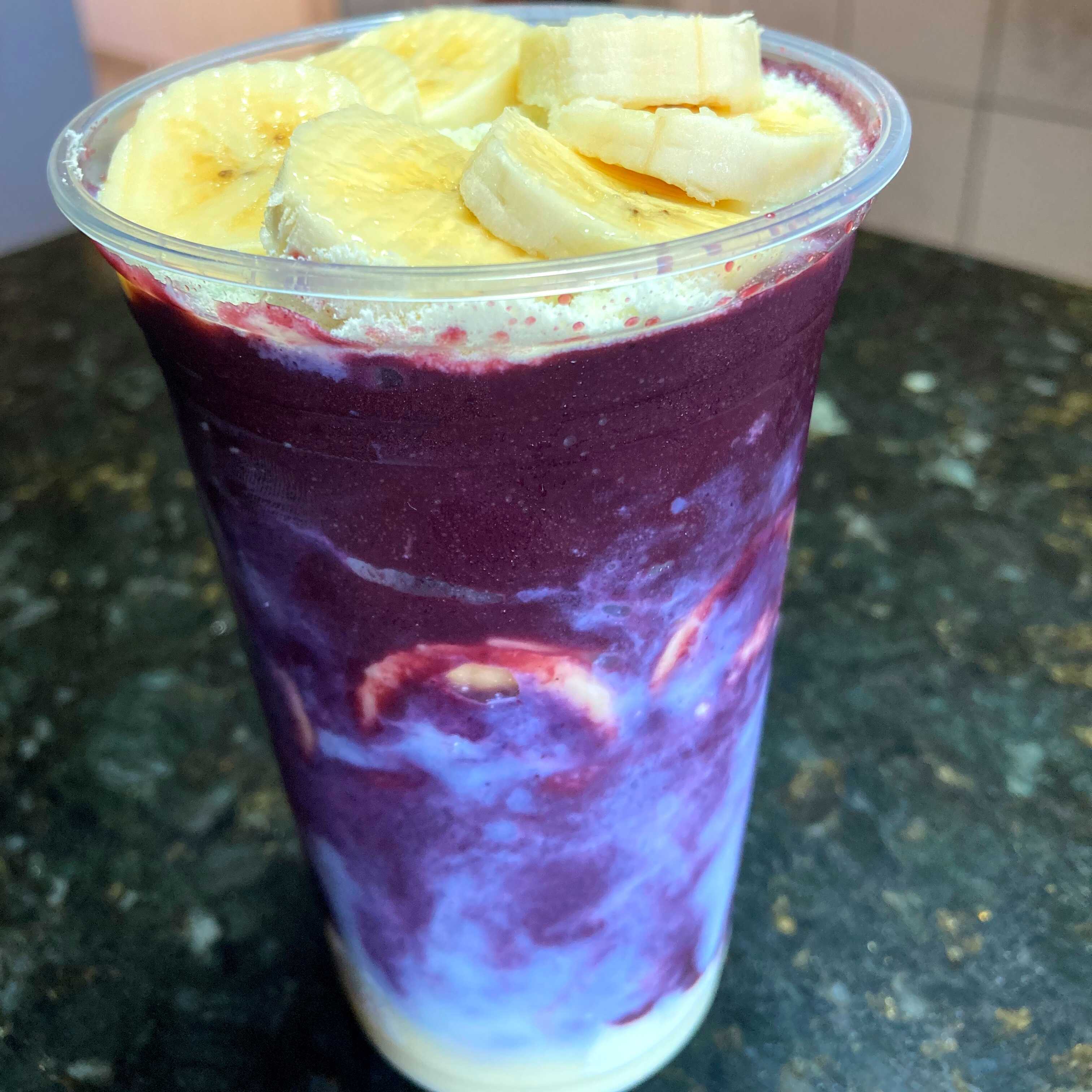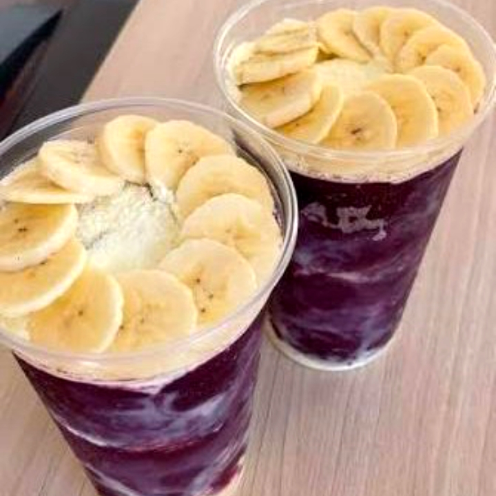 Vitamina de açaí 700ml com camadas de leite em pó, batida com leite e leite condensado.