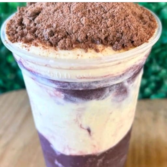 Vitamina de açaí 500ml com camadas de leite em pó, batida com leite e leite condensado.