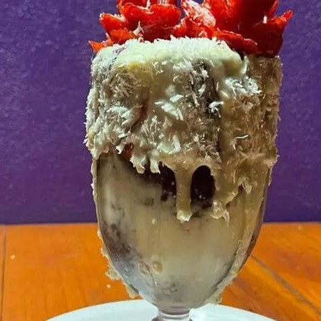 Açai,Sorvete Morango e Chocolate,Calda de Morango, Leite em pó , Leite Condensado e Banana