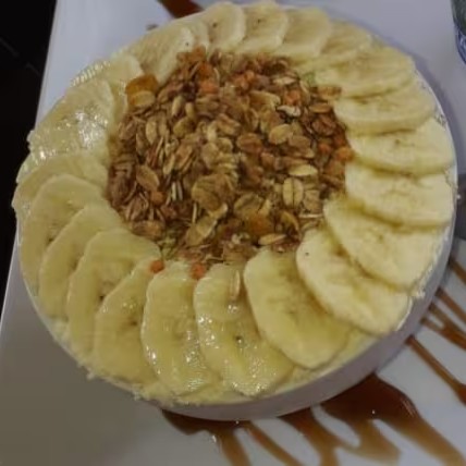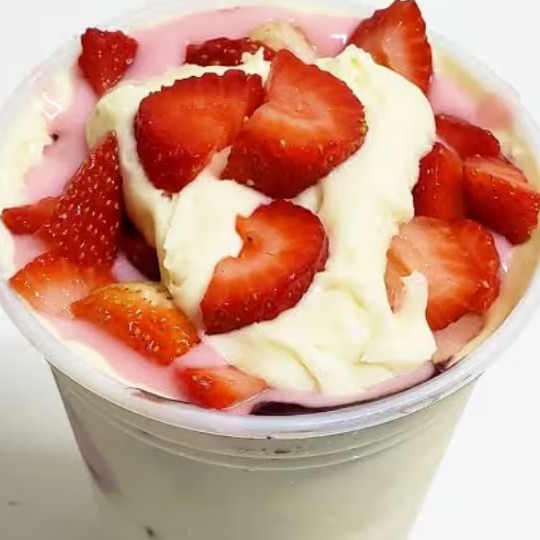 Creme de acai, morango, banana, leite em pó, leite condensado, e cobertura (todos os itens montados dentro do pote em camadas)