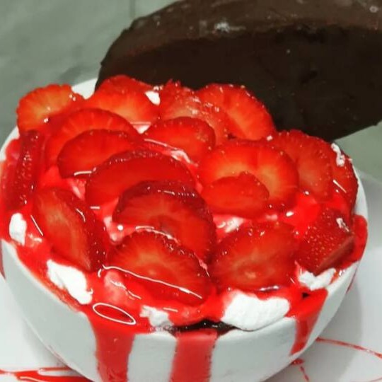Creme açaí, leite em pó, leite condensado no meio e creme Ninho e morango por cima