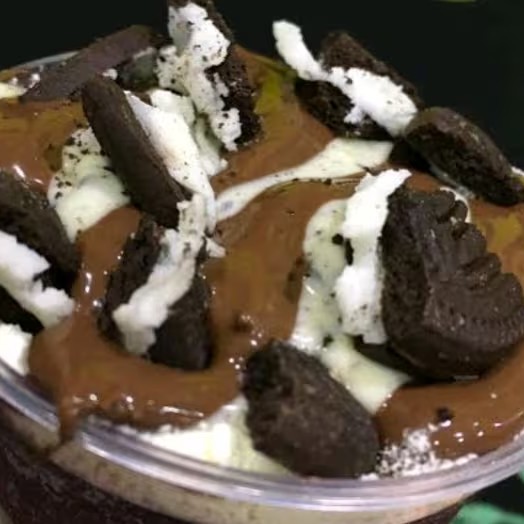 Creme de açaí +chocoball+Confete+ pacoquinha +cobertura morango (todos os itens no pote em camadas)