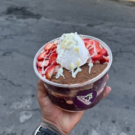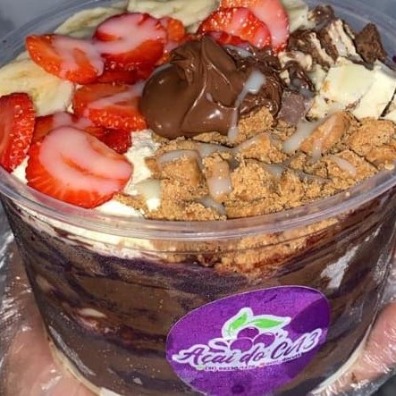 Açaí, Leite Condensado, Leite em Pó, chantilly, Ovomaltine e morango.
