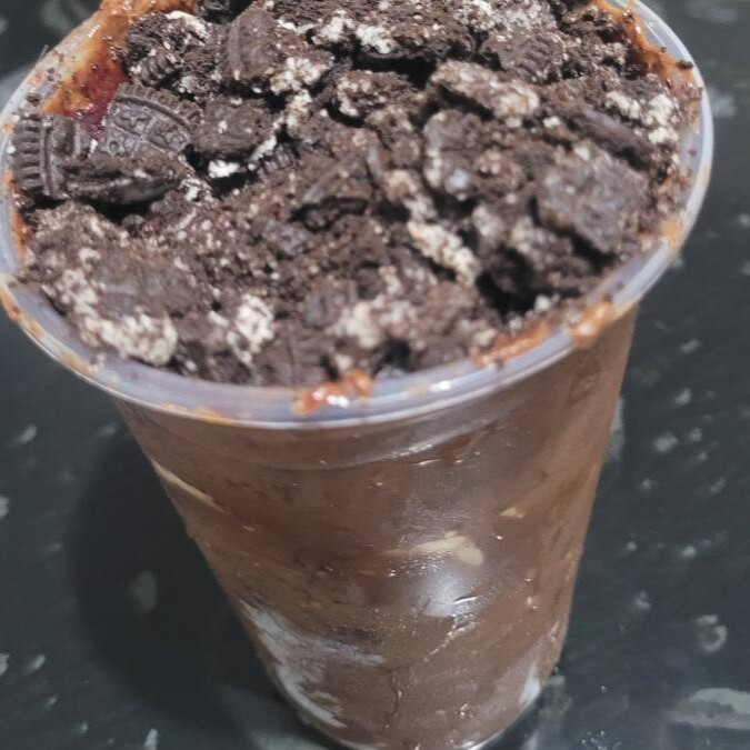 Esse delicioso copo de 700 ml, coberto por creme de avelã, acompanha, leite em pó, banana e também o biscoito Negresco!