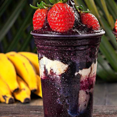 Esse delicioso açai acompanha granola, banana, leite em pó e morango em camadas dentro do copo!