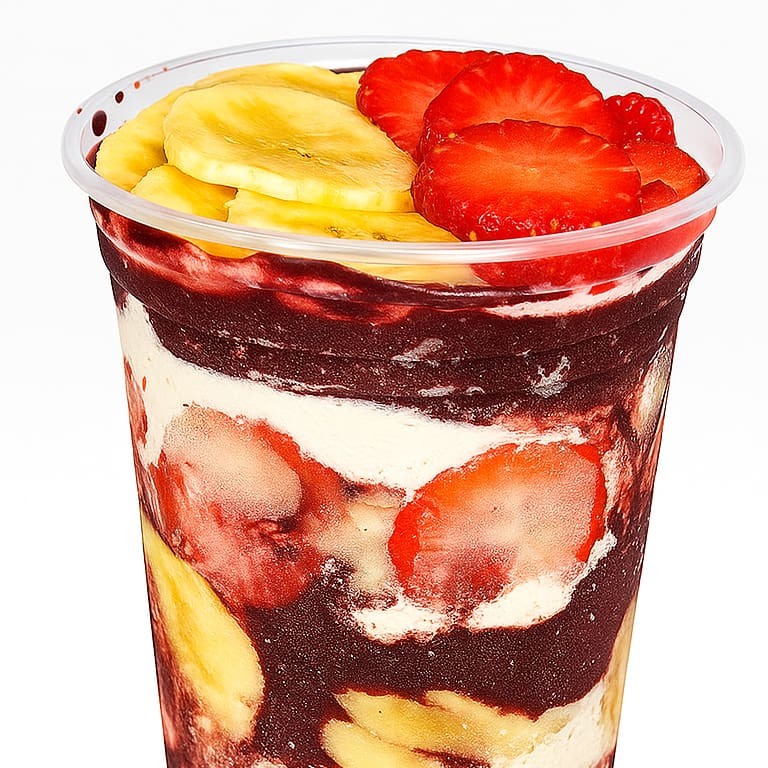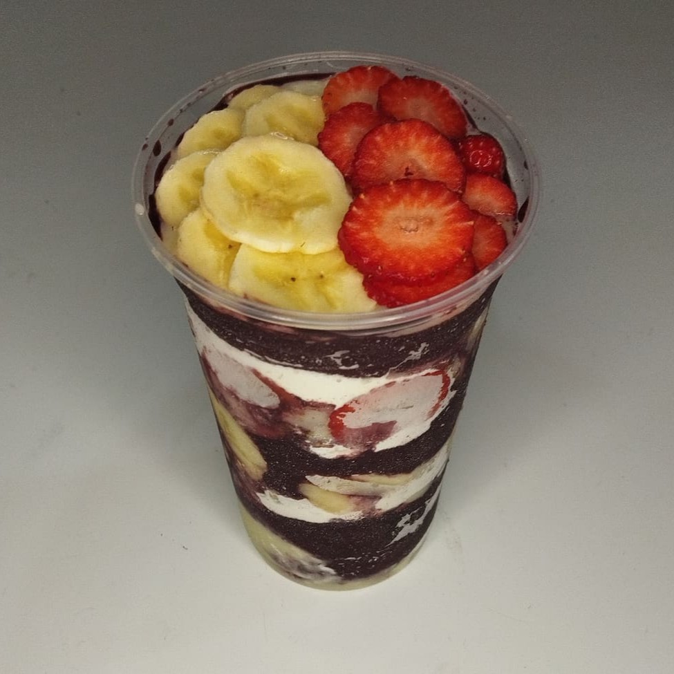 Açaí com banana, morango, granola, leite em pó e leite condensado.