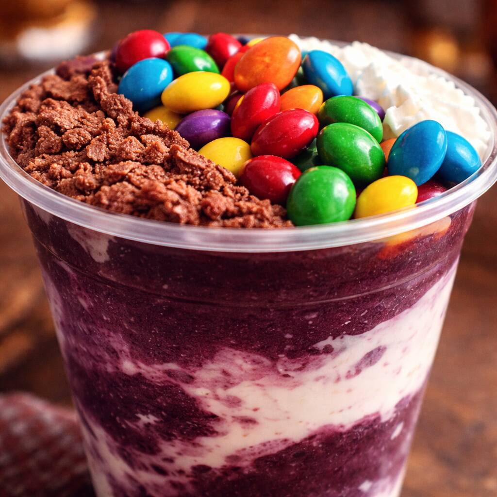 Açaí com leite em pó, leite condensado, M&M's e Ovomaltine.