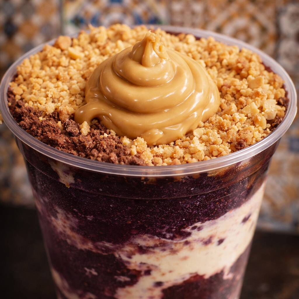 Açaí do Luigi com leite em pó, leite condensado, paçoca e creme de amendoim.
