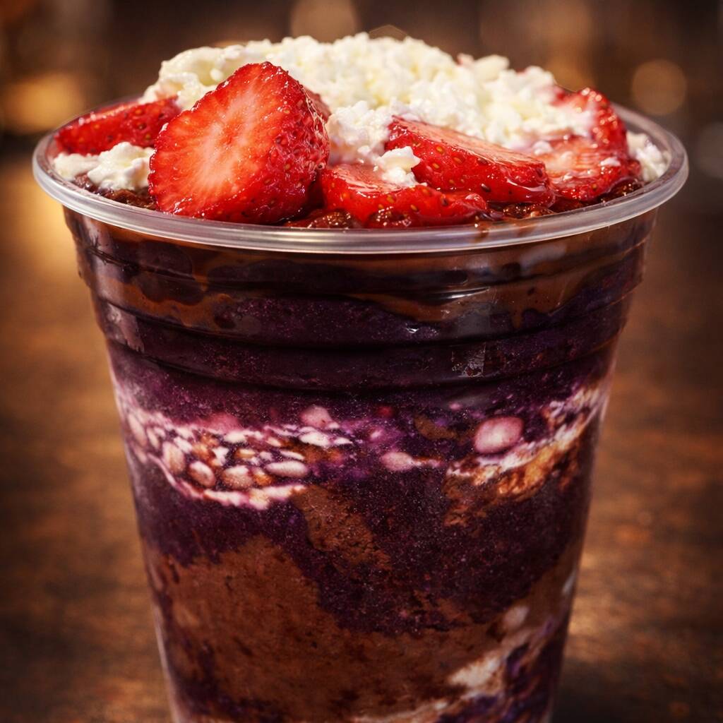 Açaí, Nutella, leite condensado e leite em pó e morango.