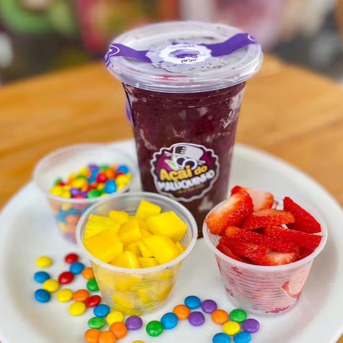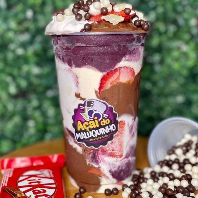 Açaí, banana, Morango, leite condensado, confetes, Kit Kat.
