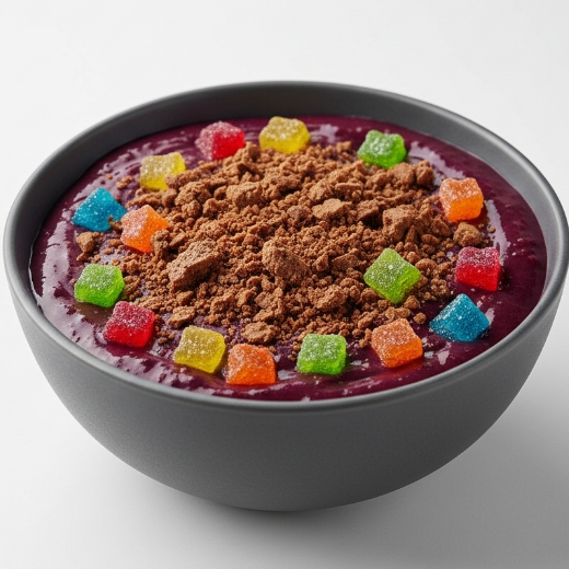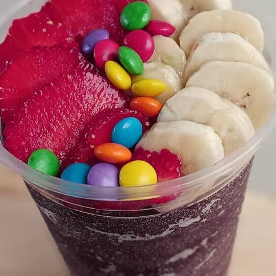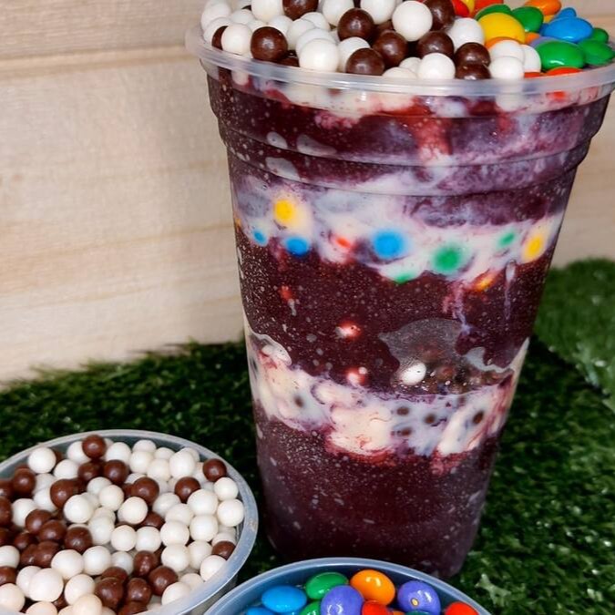 Saboreie um delicioso creme de açaí acompanhado de Ovo Maltine e bala de goma fine