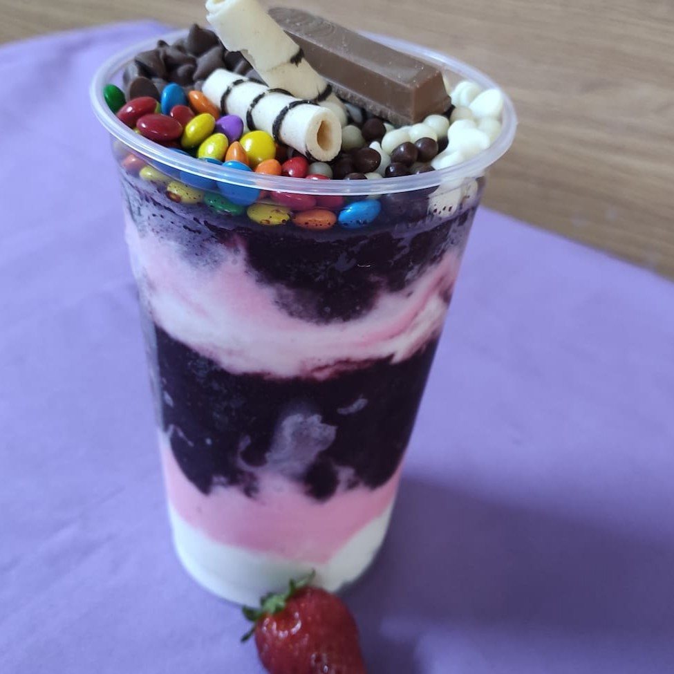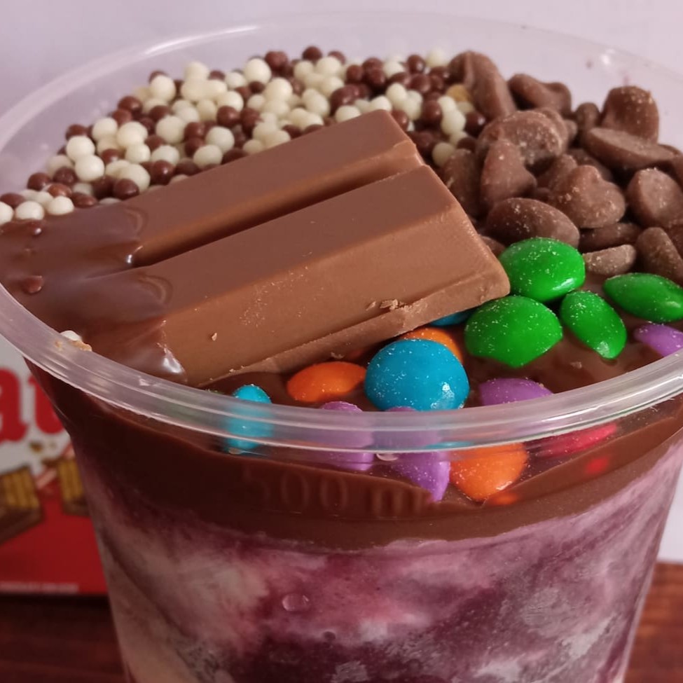 Camada de sorvete morango e baunilha, camada de açaí e creme de avelã, confetes, chocobool, gotas de Chocolate, Kit Kat, tubete.