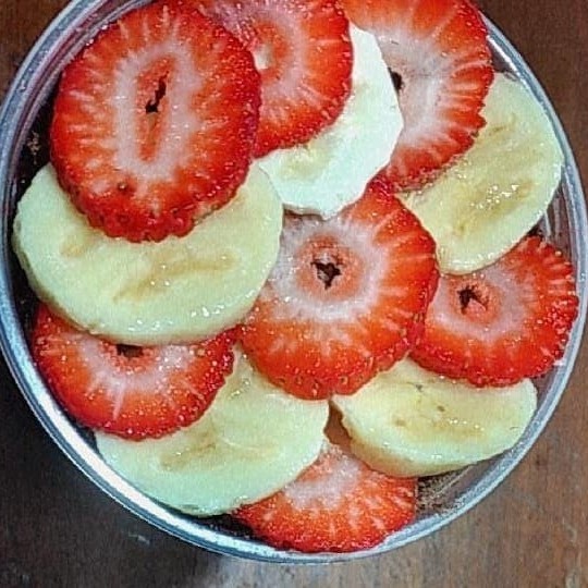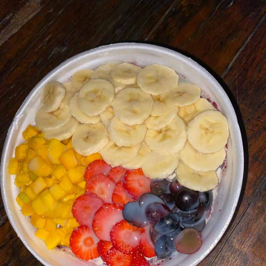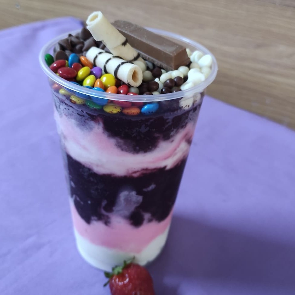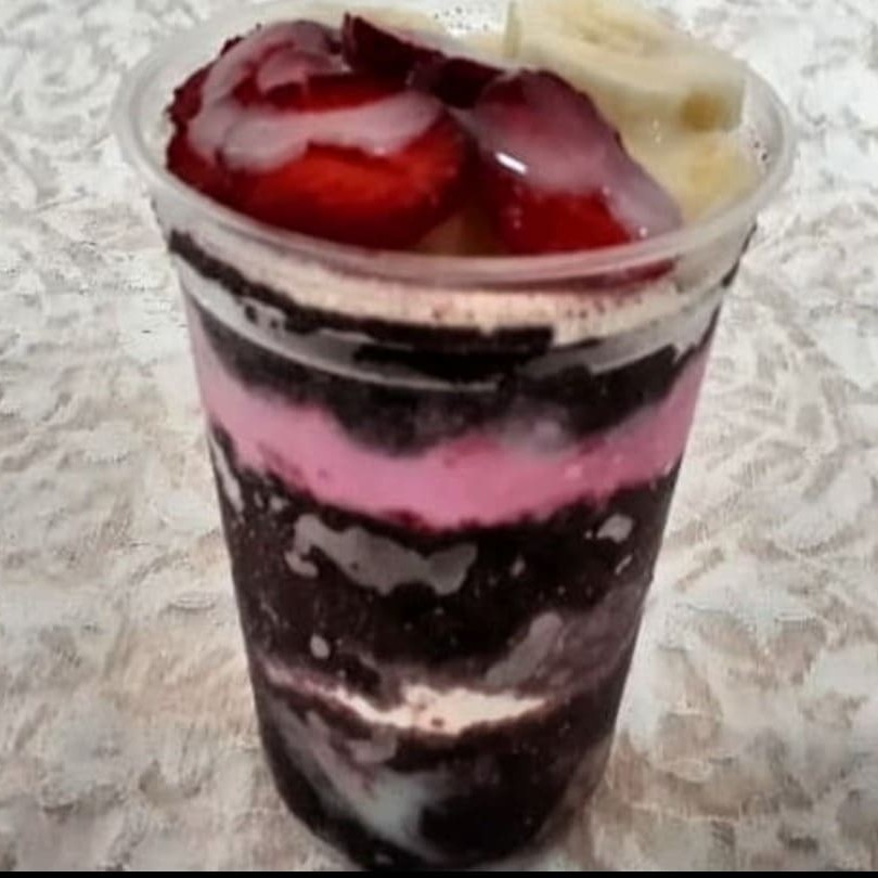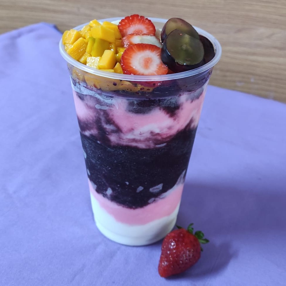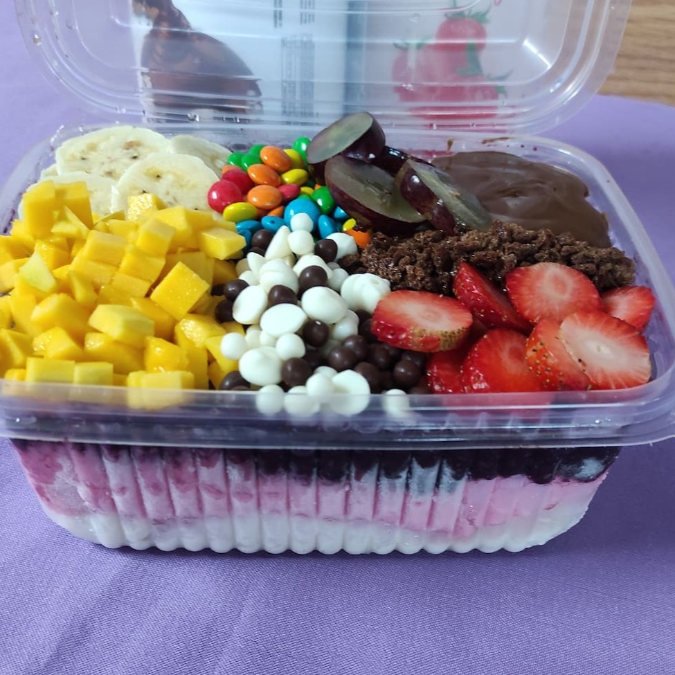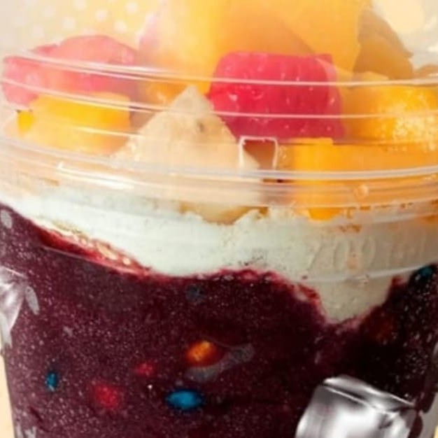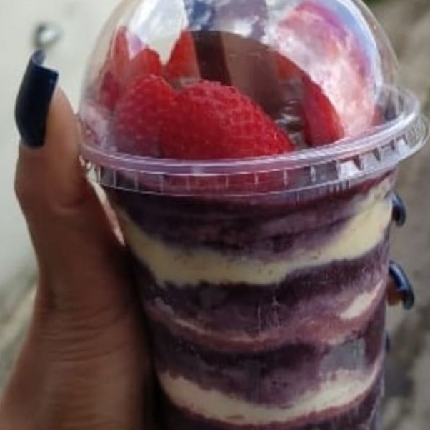 Camada de sorvete morango e baunilha, camada de açaí, frutas, manga, banana, uva, morango, leite em pó e leite condensado.