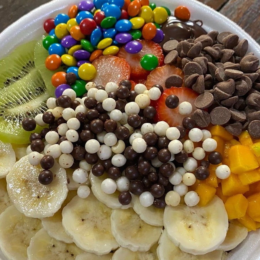 Creme de Açaí, frutas, leite em pó, leite condensado, Chocoball, confetes creme de avelã, gotas de chocolate. O cliente poderá trocar as guloseimas pelos itens abaixo. Gotas de chocolate, paçoca, amendoim e granola. Observação: as frutas podem variar de acordo com a época do ano ou mês. ------------------------Tags---------------------------- Açaí, Açaí trufado, Barca de açaí, chocolate, chanteninho, milkshake, promoção, taxa grátis, oferta, off, 0800