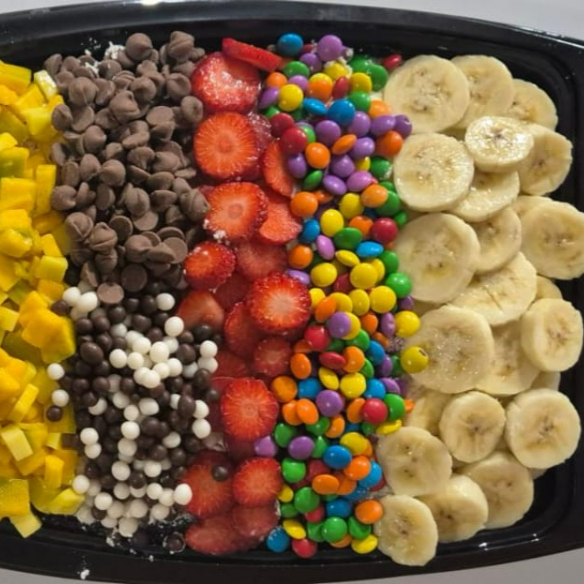Camada de sorvete morango e baunilha, camada de açaí, frutas, manga, banana, uva, morango, leite em pó, Chocoboll, confetes, creme de avelã, leite condensado.