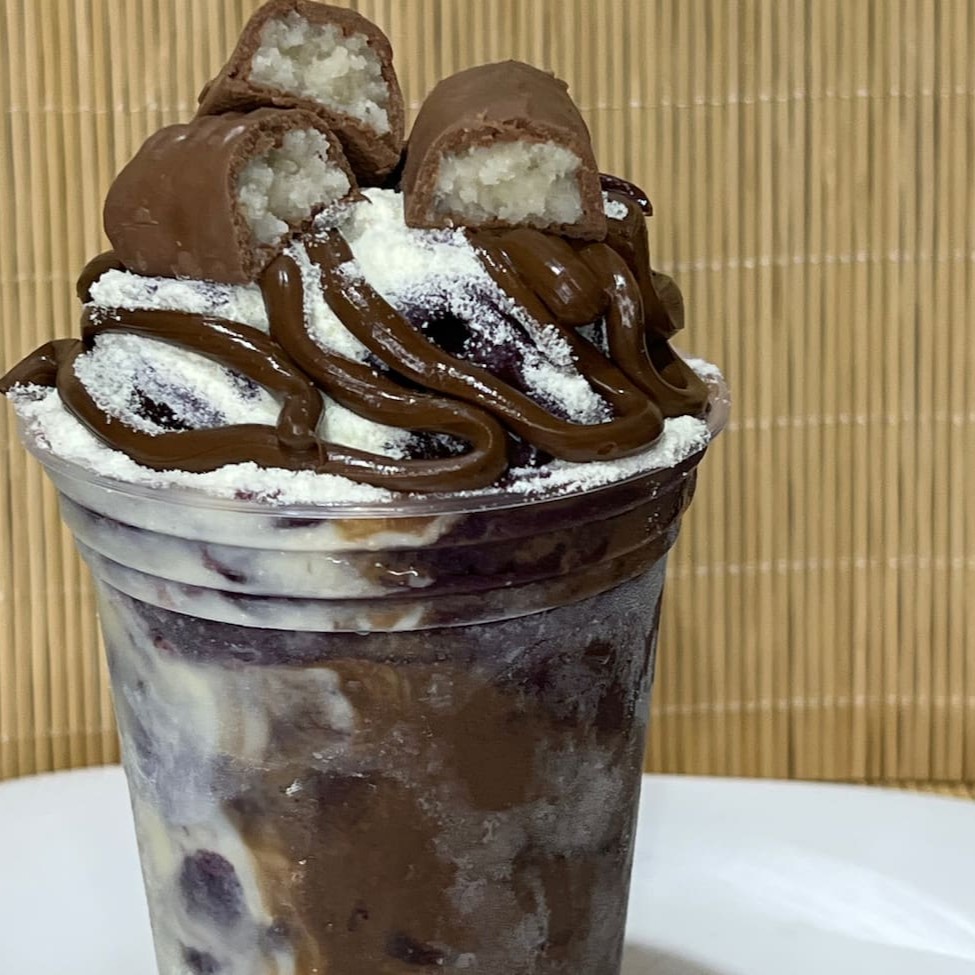 Açaí, leite em pó, creme Ninho, creme avelã, coco ralado e Prestígio.