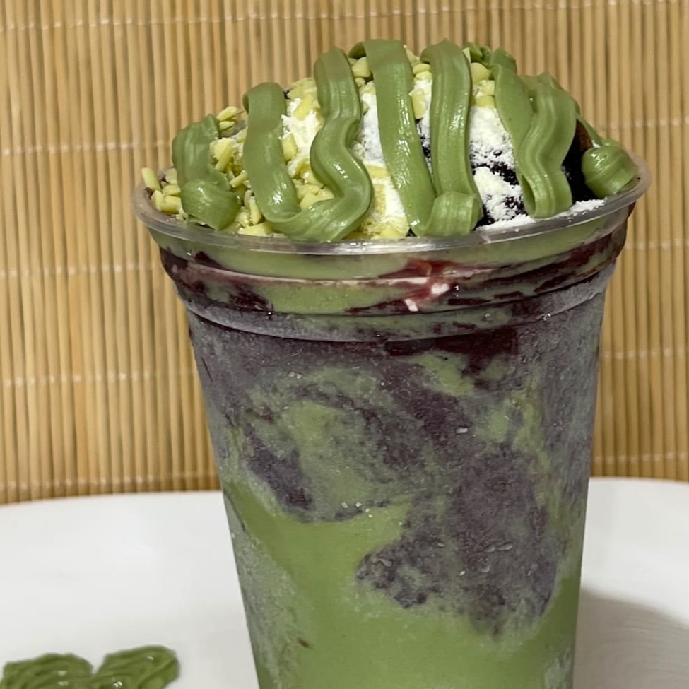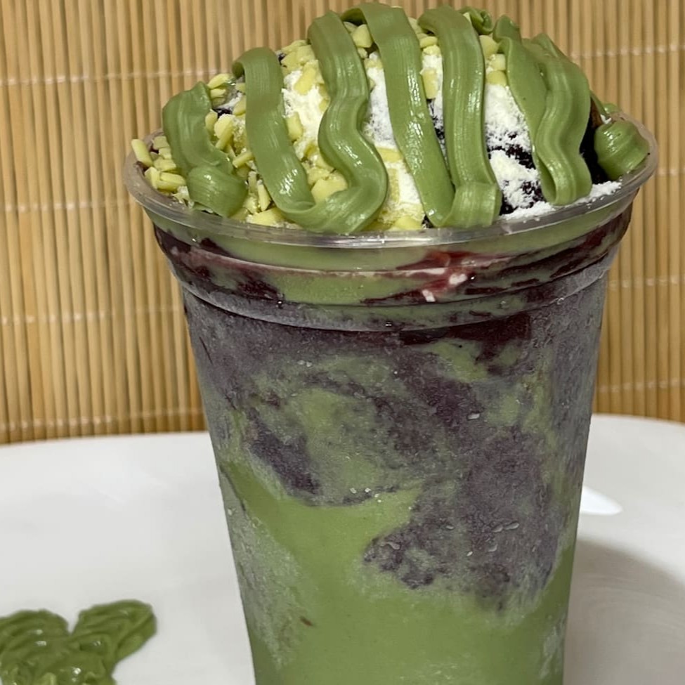 Açaí, leite em pó, creme de pistache e granulado de pistache