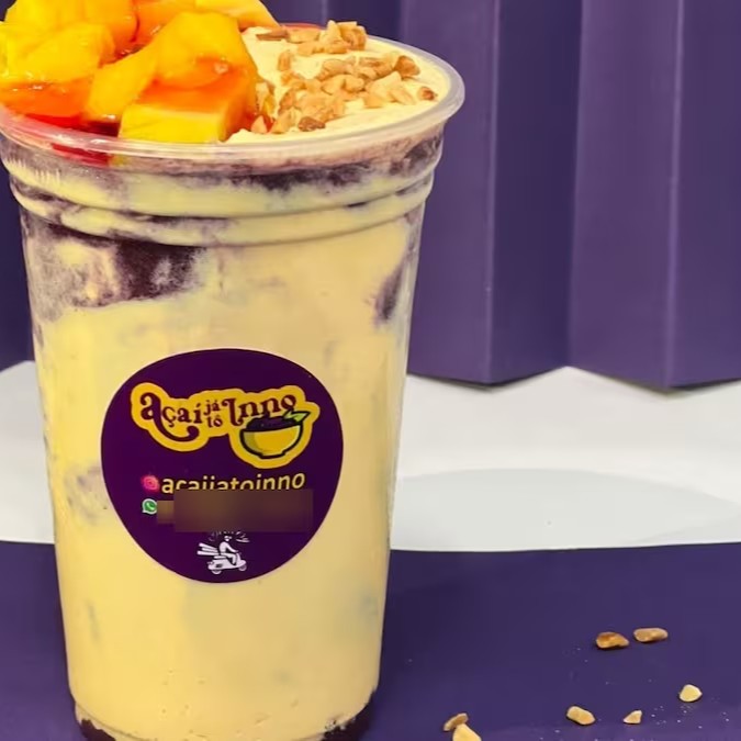 Açai , creme de Maracujá ,leite em po, leite condesado , amendoim , manga e cobertura de morango.