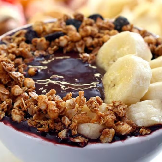 Creme de açaí, Banana, Granola, Leite em pó e Leite condensado.