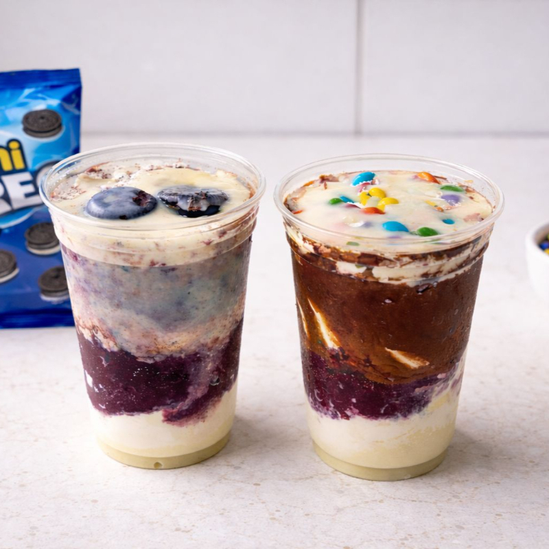 1 Açai Oreo 300ml: -Açaí -Leite Condensado -Leite em pó -Ovomaltine -Creme de Oreo 1 Açaí Fantasia300ml: -Açaí -Leite Condensado -Leite em pó -Confete -Nutella