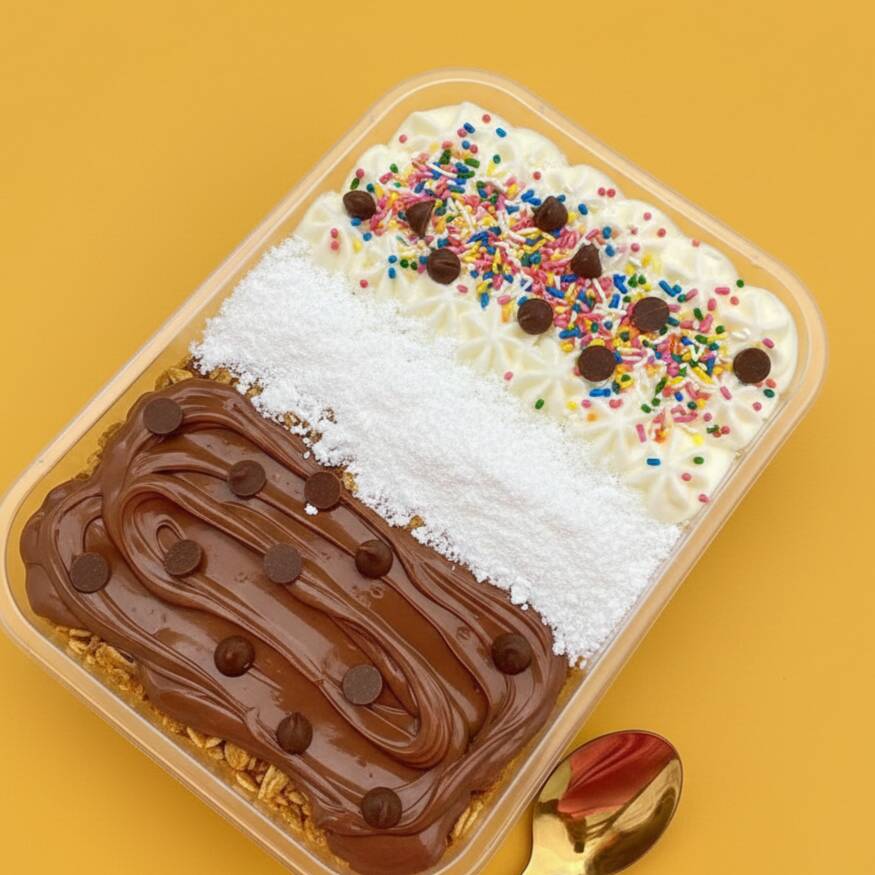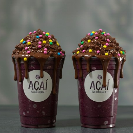 2 cremes de açaí (500 ml), acompanhados de gotas de chocolate ao leite, granulado ao leite, confetes e cobertura de chocolate. Os itens são enviados no mesmo pote do creme de açaí. Os acréscimos pagos são enviados em potinhos separados.