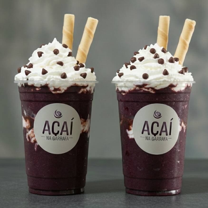 2 cremes de açaí (330ml), acompanhados de gotas de chocolate ao leite, chantilly, cobertura de chocolate e tubetes de baunilha. Os itens são enviados no mesmo pote do creme de açaí. Os acréscimos pagos são enviados em potinhos separados.