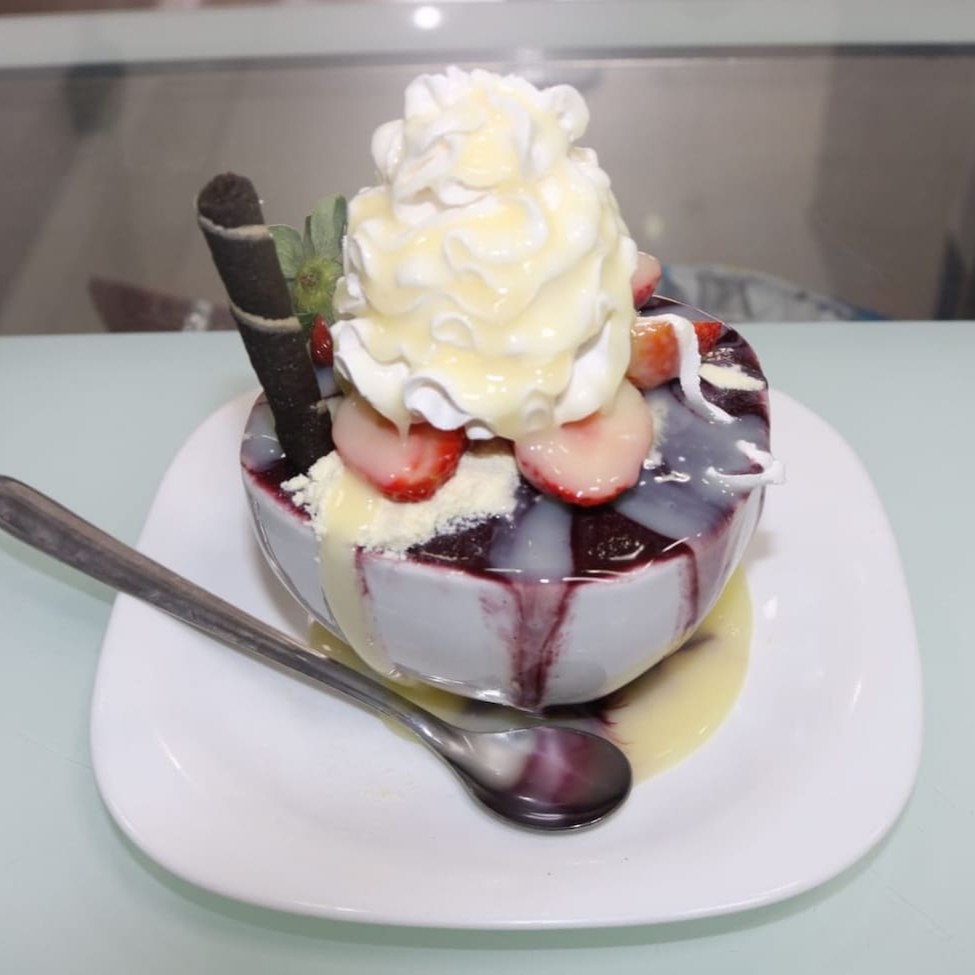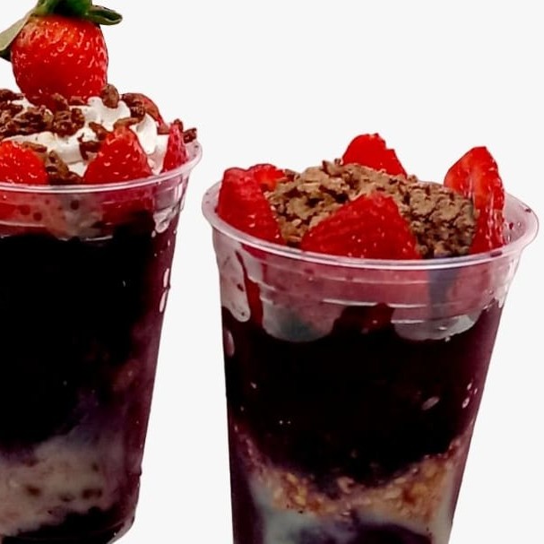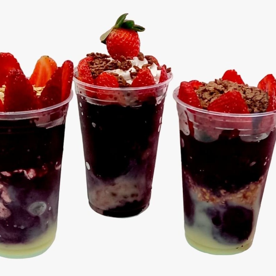 Açaí + leite condensado + morango + leite pó + chantilly.