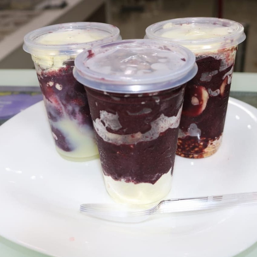 São 3 Copos de açaí cremoso de 300 ml com 3 adicionais em camadas, podendo selecionar os adicionais. leite Condensado, leite em pó, morango, banana, paçoca, chantilly, manga, amendoim ou gotas de chocolate.