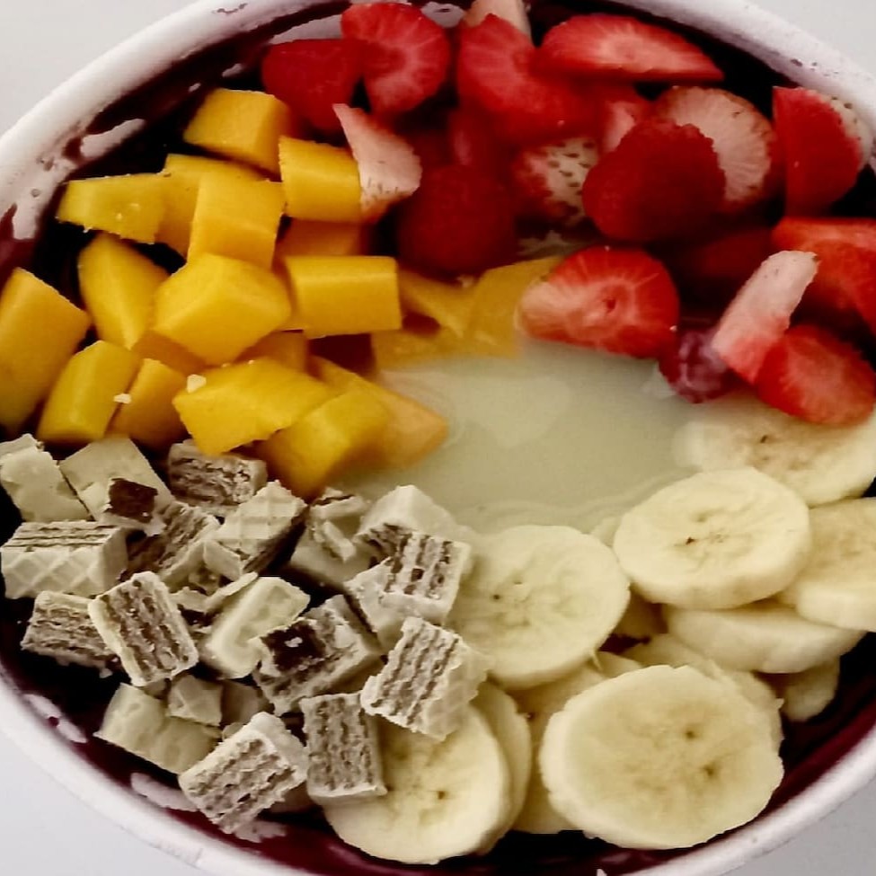 Açaí + leite condensado + banana + granola+amendoim.