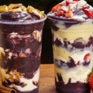 São 2 copos de açaí cremoso de 700ml com 5 adicionais em camadas, podendo selecionar os adicionais. Não repetimos adicionais e não fazemos com menos de 4 adicionais diferentes.