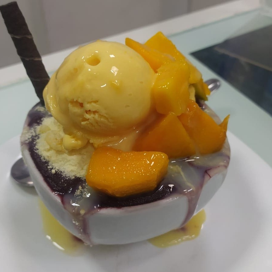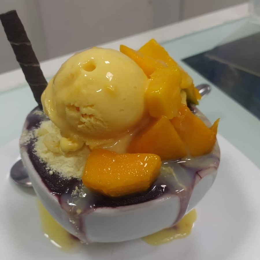 Açaí + leite condensado + mousse de maracujá + manga + leite em pó .