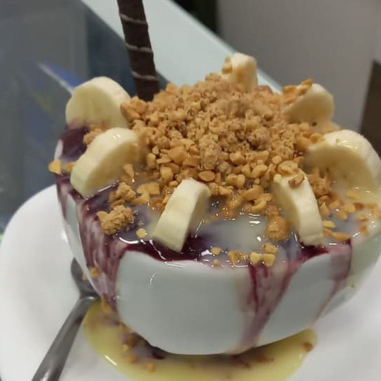 Açaí + leite condensado + banana +Granola + amendoim.