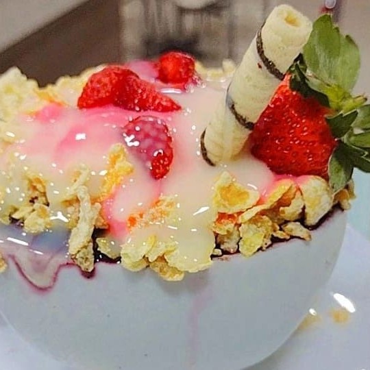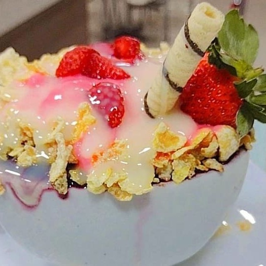 Açaí + leite condensado + morango + mousse morango + sucrilhos.