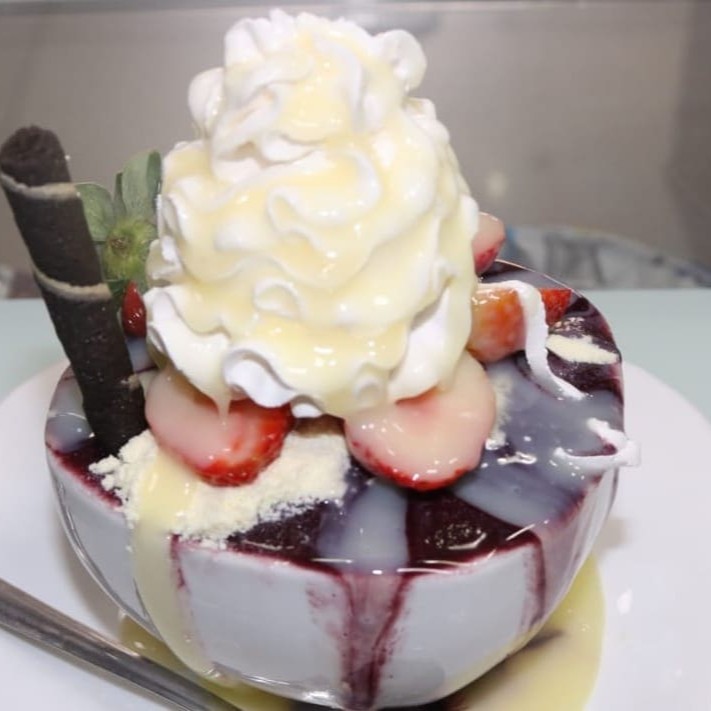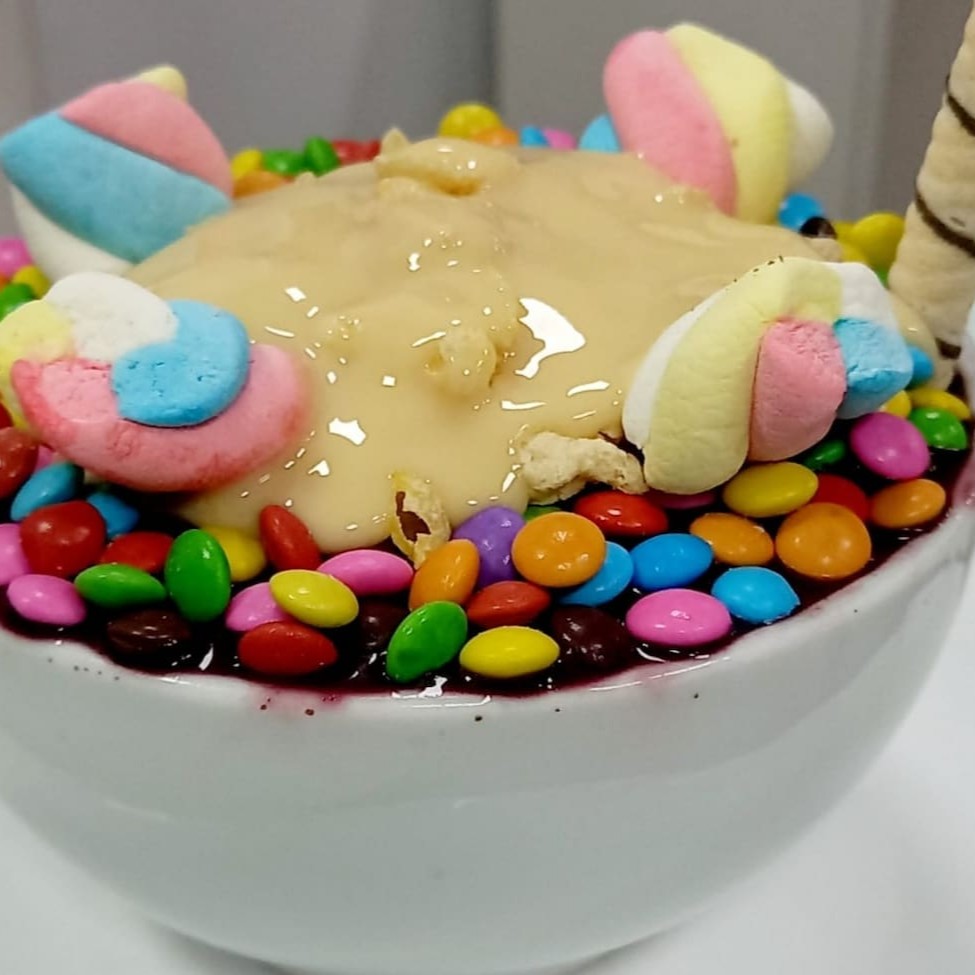 Açaí + leite condensado + confetes + sucrilhos+ marshmallow.