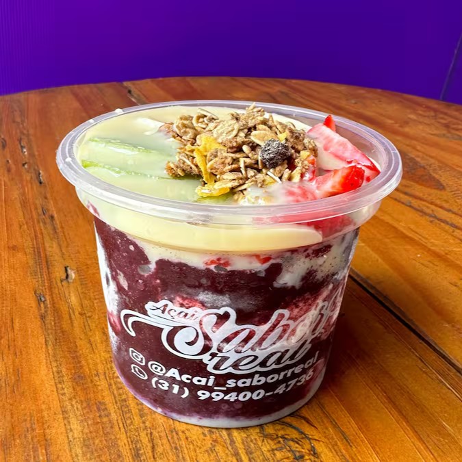Pote montado em camadas, com nosso açaí cremoso, acompanhado de leite em pó, leite condensado e frutas frescas (manga, uva e morango).